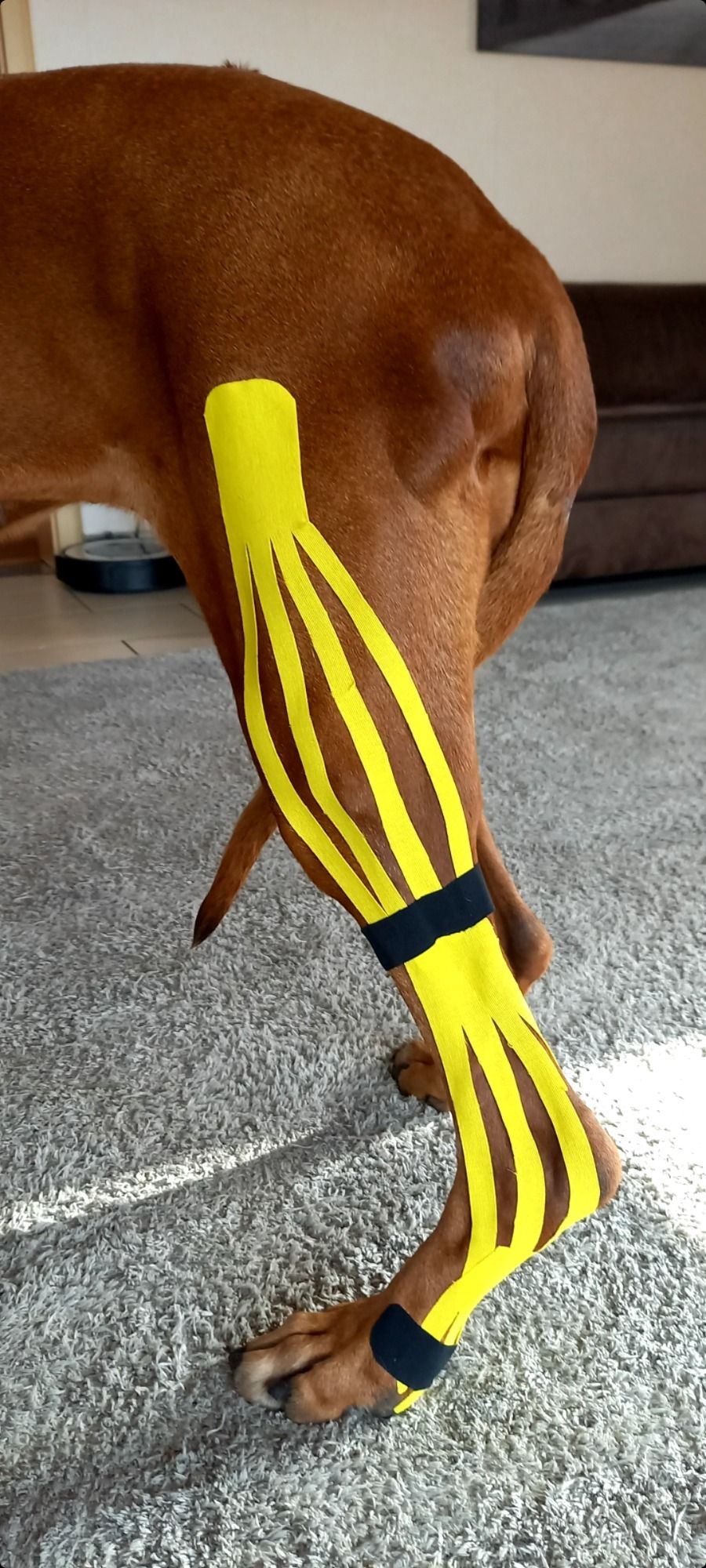 Durch das Tape entsteht ein „Anhebe-Effekt“ von Haut und Fell, wodurch Platz im Gewebe darunter entsteht. Dadurch können sich Gefäße weiten, Blut und Lymphflüssigkeit können besser fließen und Abbauprodukte können besser abtransportiert werden. Daraus ergibt sich eine bessere Durchblutung des Gewebes und damit einhergehend eine bessere Versorgung mit Nährstoffen, Mineralstoffen und Sauerstoff. Dieser "Anhebe-Effekt" setzt sich dann in der nächst tieferen Gewebeschicht fort und arbeitet sich Schicht für Schicht auch in tiefer liegende Gewebsschichten. (Quelle: Kinesiologisches Taping für Hunde, Katja Bredlau-Morich)